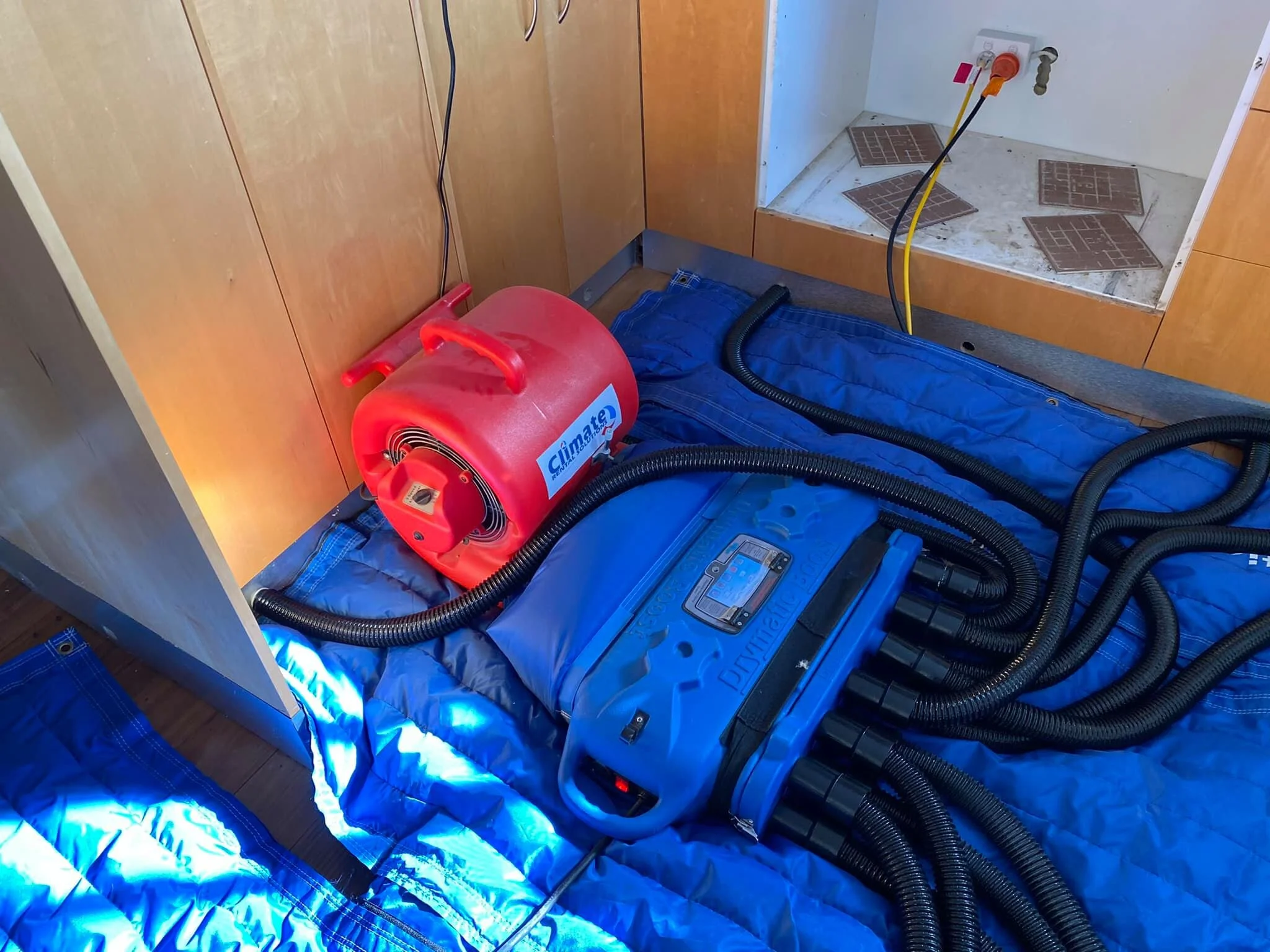On the upper level there are more air movers setup with Boost bars and floor mats to dry the timber floor. The floor mats are target drying the timber floor but one of the Boost bars is also used for another function on this job. Using a 12port attachment on the Boost bar to inject heat underneath the kitchen bench by drilling holes into the kicks. Some holes in the kicks are also used as exhaust holes to push out any moisture. With some ports not being used on the Boost bar the additional hoses are connected into the floor mats to increase the air flow. Another Drymatic II is used on the upper level to control the air temperature and moisture being used by the air movers. The Drymatic II will heat and recirculate the air and then exhaust the wet air out through the window as well.