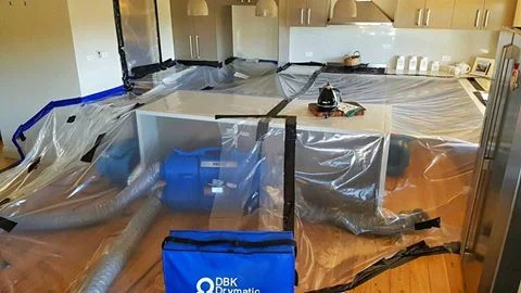 McArdle's Restoration received a job that was a water ingress from the ice dispenser on the fridge in the kitchen the timber floor is a 19mm Cyprus pine on 19mm ply on concrete subfloor. They created a drying chamber in the kitchen that was able to heat the area up to 44 degrees Celsius and 15% relative humidity, with a timber floor temperature of 61.8 degrees Celsius.